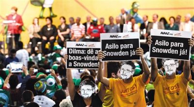 19日,巴西圣保羅,支持者戴著斯諾登面具,要求巴西總統羅塞夫接受斯諾登的避難申請。美國《華盛頓郵報》24日刊登對美國“棱鏡門”曝光者愛德華·斯諾登的專訪。斯諾 ...