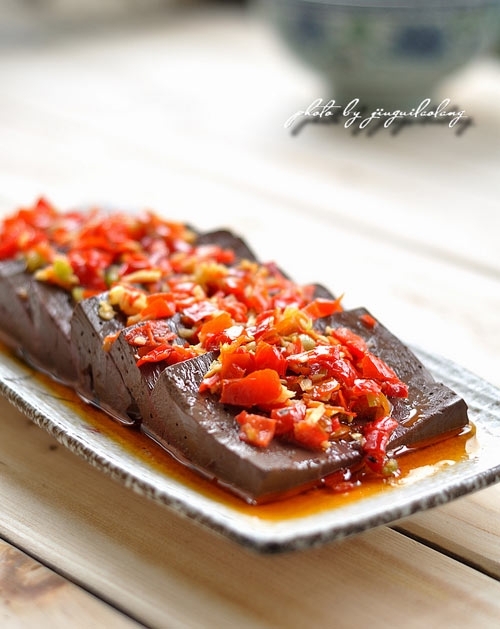 鴨血脆嫩,爽口,一般在吃火鍋時會來上一盤,用熱熱的湯水煮制然后蘸上料汁吃,或者偶爾做個酸辣的味道的解饞。 血豆腐是清道夫,也就是說是清肺的食材,久食則健肺。 食材明細:成品鴨血、剁椒 ...