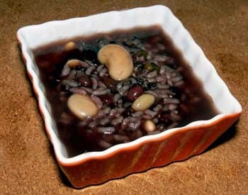 做法:將黃豆、綠豆、黑豆、紅豆、花生、薏米入水浸泡過夜;沖洗干凈,加紫米,小米,紅棗,足量的清水,大火熬開,轉小火熬煮2-3個小時。