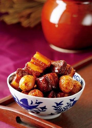 關于虎皮蛋的制作方法: 外婆紅燒肉中如果加入虎皮蛋(傳統(tǒng)的是虎皮鵪鶉蛋)味道會更好,具體的做法是:涼鍋坐油,待油溫達到7成熱后,將煮熟,剝好皮的蛋入油鍋,炸至金黃色、蛋皮皺縮撈出即可。炸蛋時,剝好的白蛋一定不能有破的地方,否則會爆鍋。
