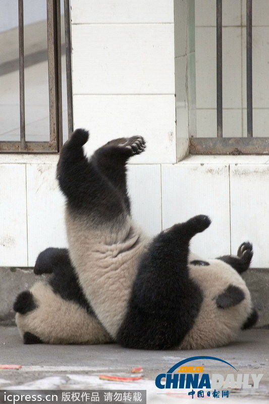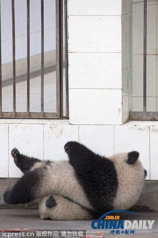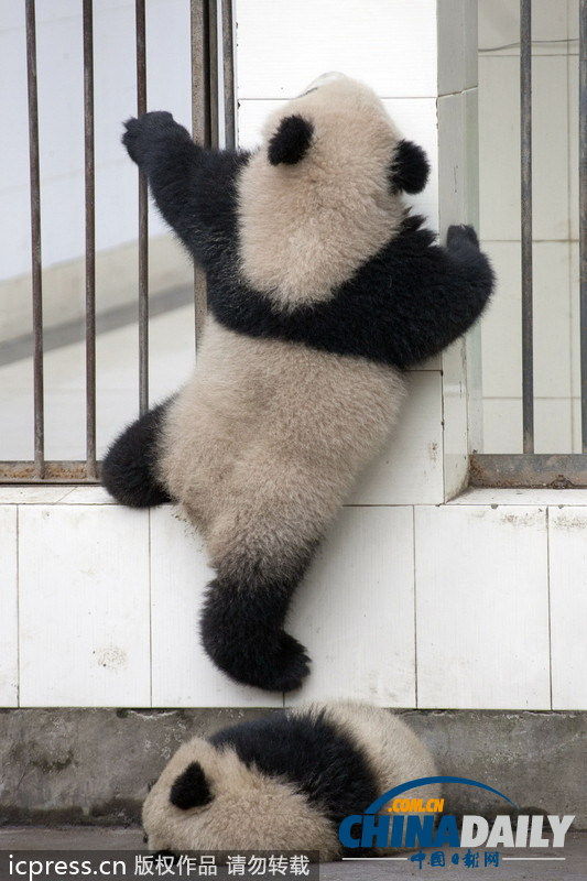 兩熊貓合作翻墻“逃亡”,不敵腿短越獄終告失敗。